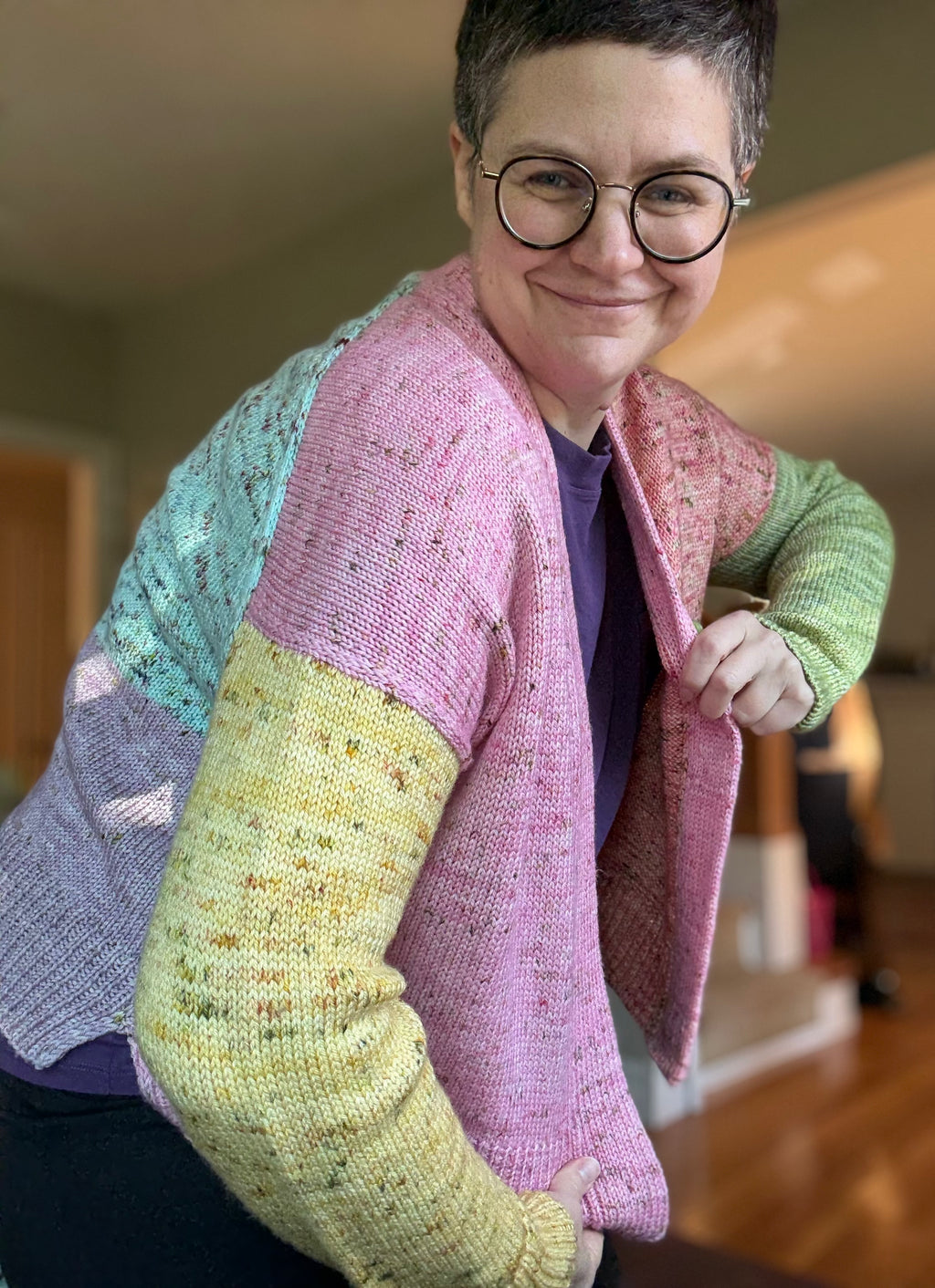 Join Jody to knit her Ice Cream Shop Cardigan - it's a joyful color block cardigan featuring 6 colors of DK yarn.